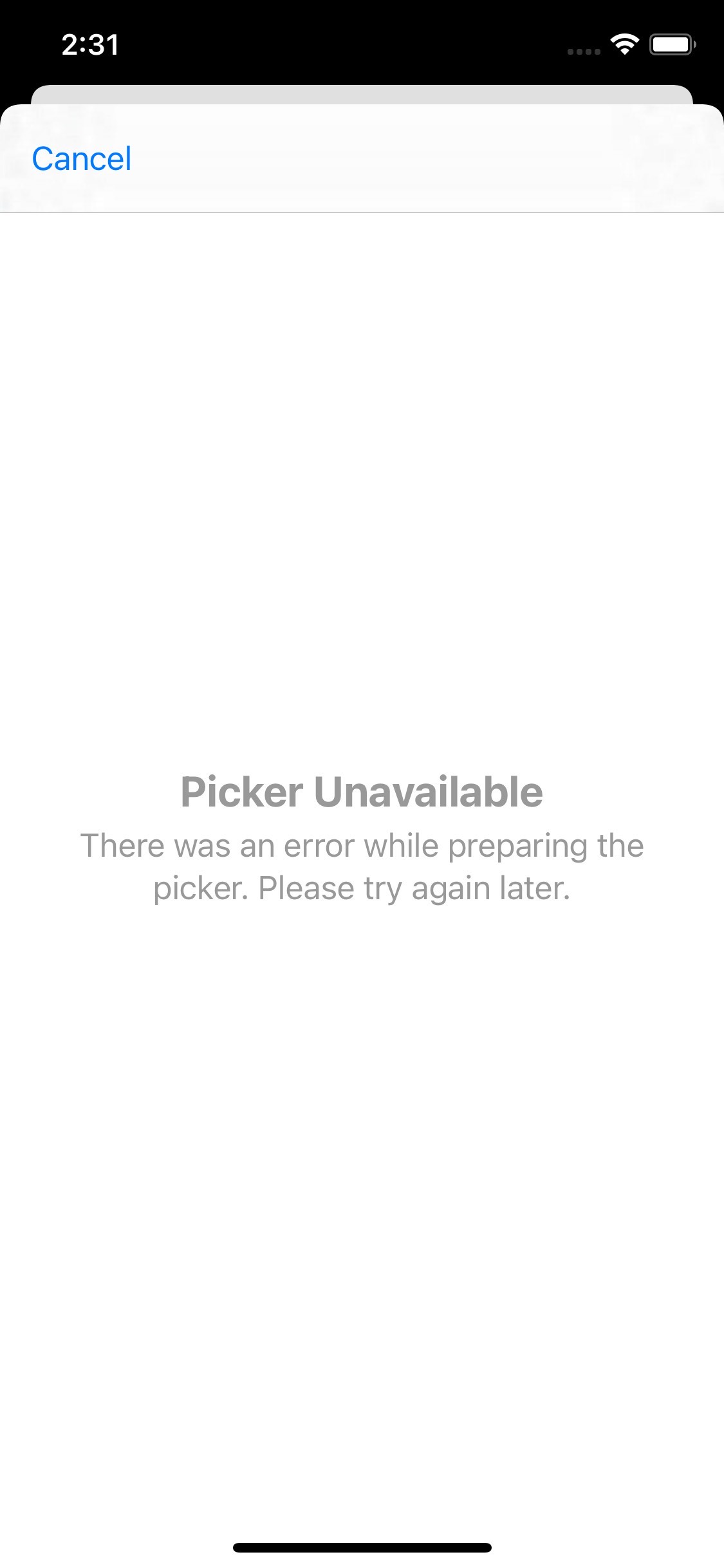 [Picker] Picker failed with error: Error Domain=PXErrorDomain Code=-1 “PHPickerViewController did timeout.” UserInfo={NSDebugDescription=PHPickerViewController did timeout.}